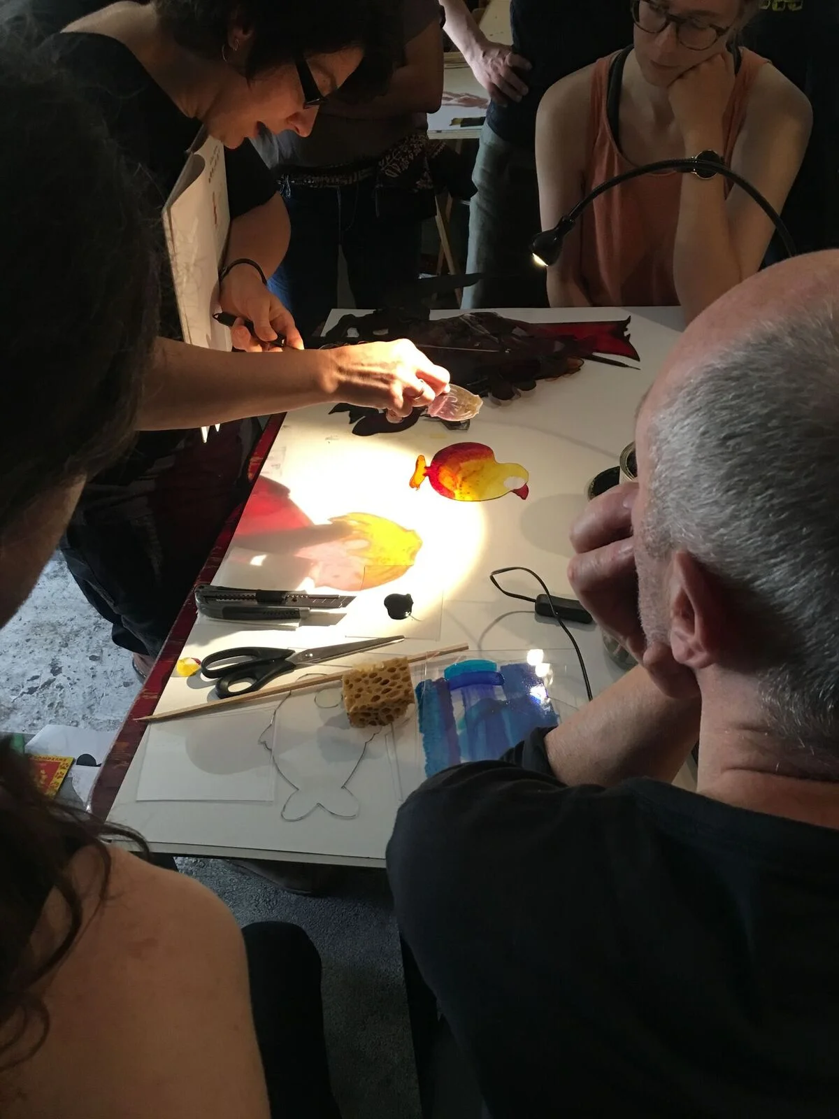 Teatro Gioco Vita designer Nicoletta Garioni leading a lecture on colored shadow puppets. Here, she demonstrates the use of glass paint on polycarbonate. Photos provided by Dustin Curtis.