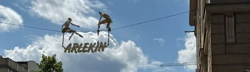 Figures suspended over the street in front of the Arlekin Puppet Theatre. Photo by author.