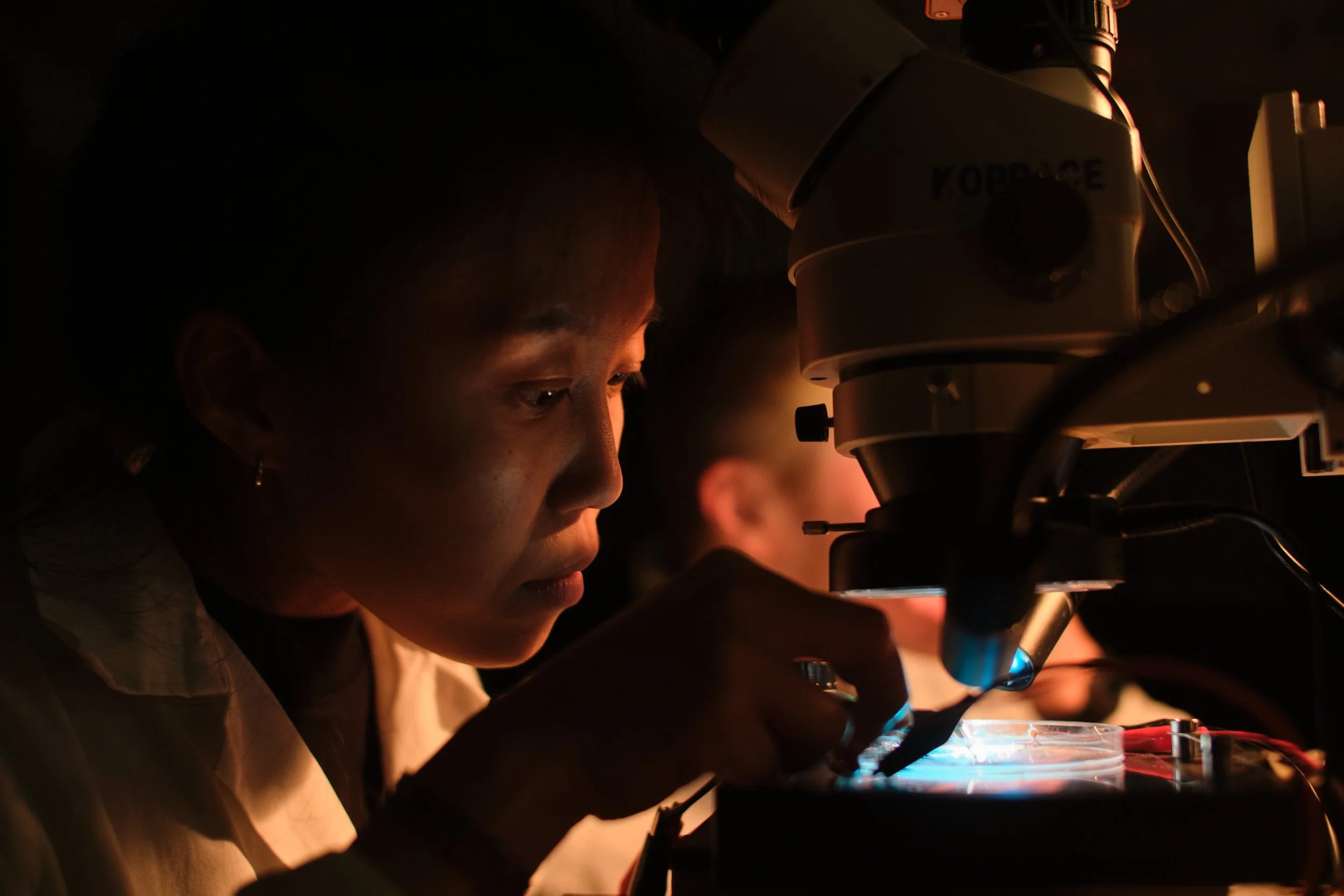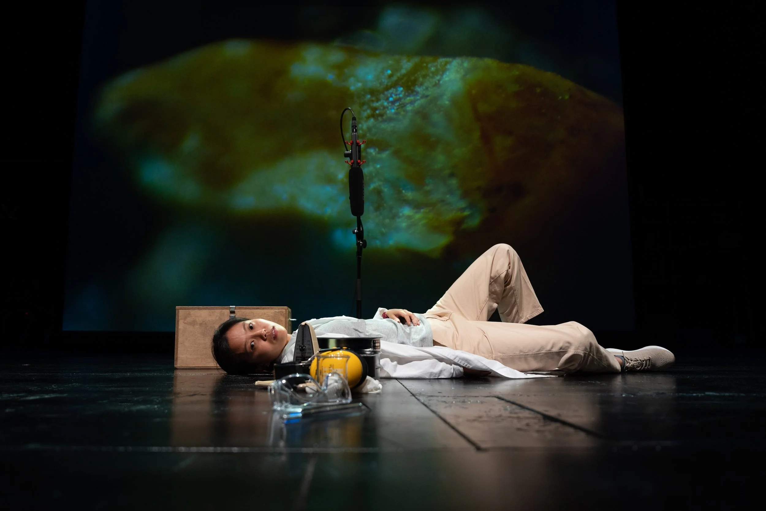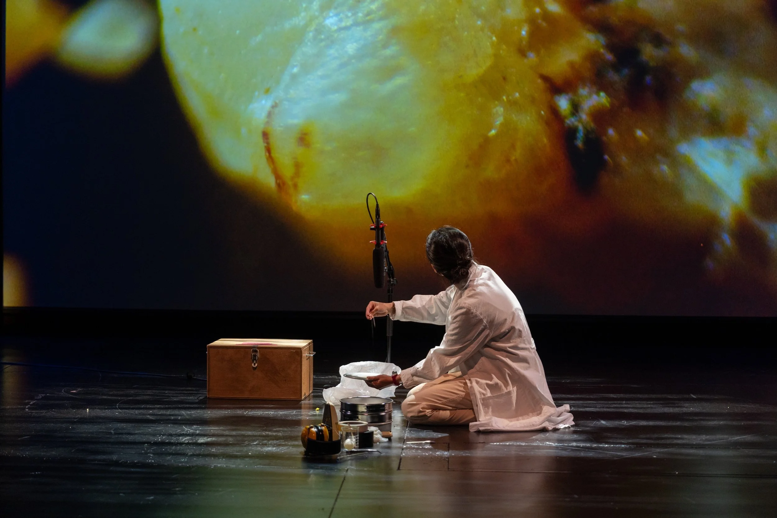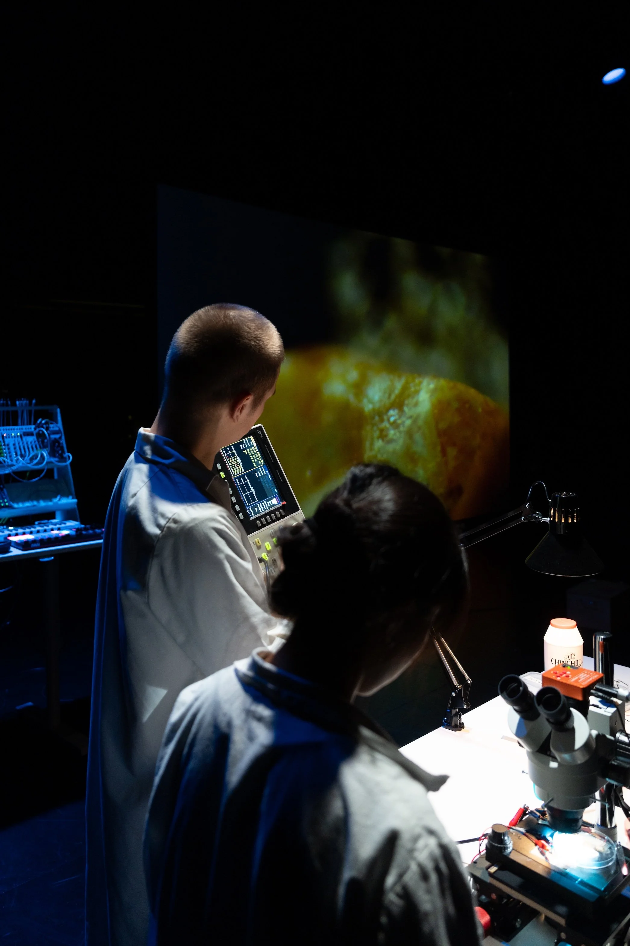 En Ping Yu and Valtteri Alanen acoustically animating microscopic tin particles, Nano Steps - a Particle Performance, Helsinki City Theatre (2023). Photo by: Miika Storm